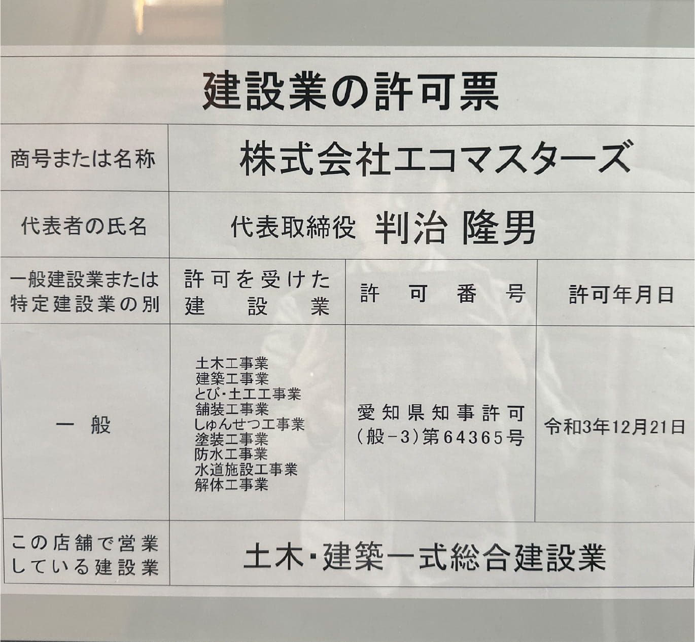 | 許可 | 愛知県知事許可(一般)第64365号 |