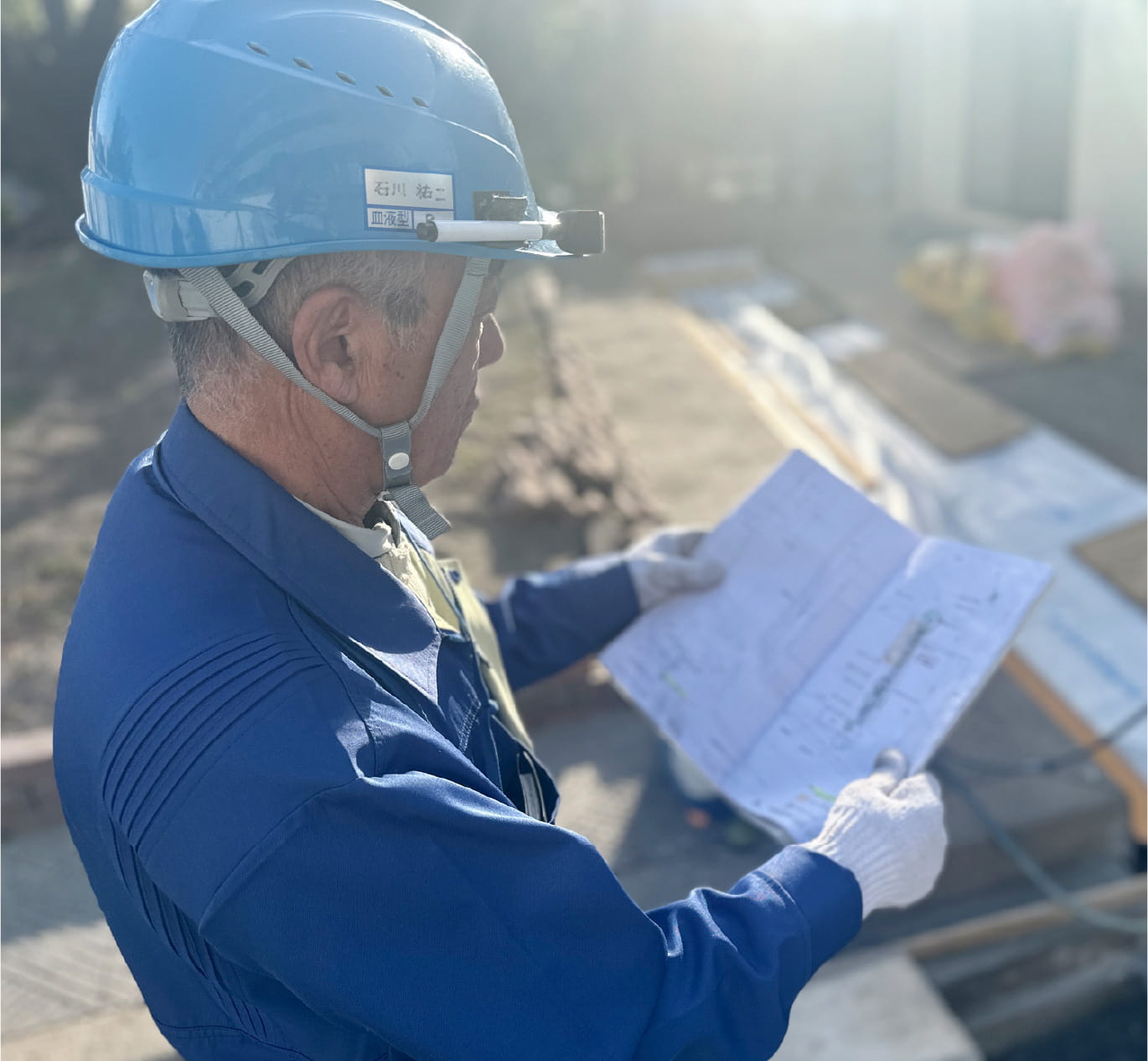 未経験の方も大歓迎。初めは先輩に同行して仕事を見せてもらいながら、必要な知識を付けていきましょう。個人差はありますが、早い人だと3ヵ月程度で簡単な現場に対応できるようになっていきます。規模の大きい現場もあるため、難しい工事については先輩が引き続きフォローしていきます!